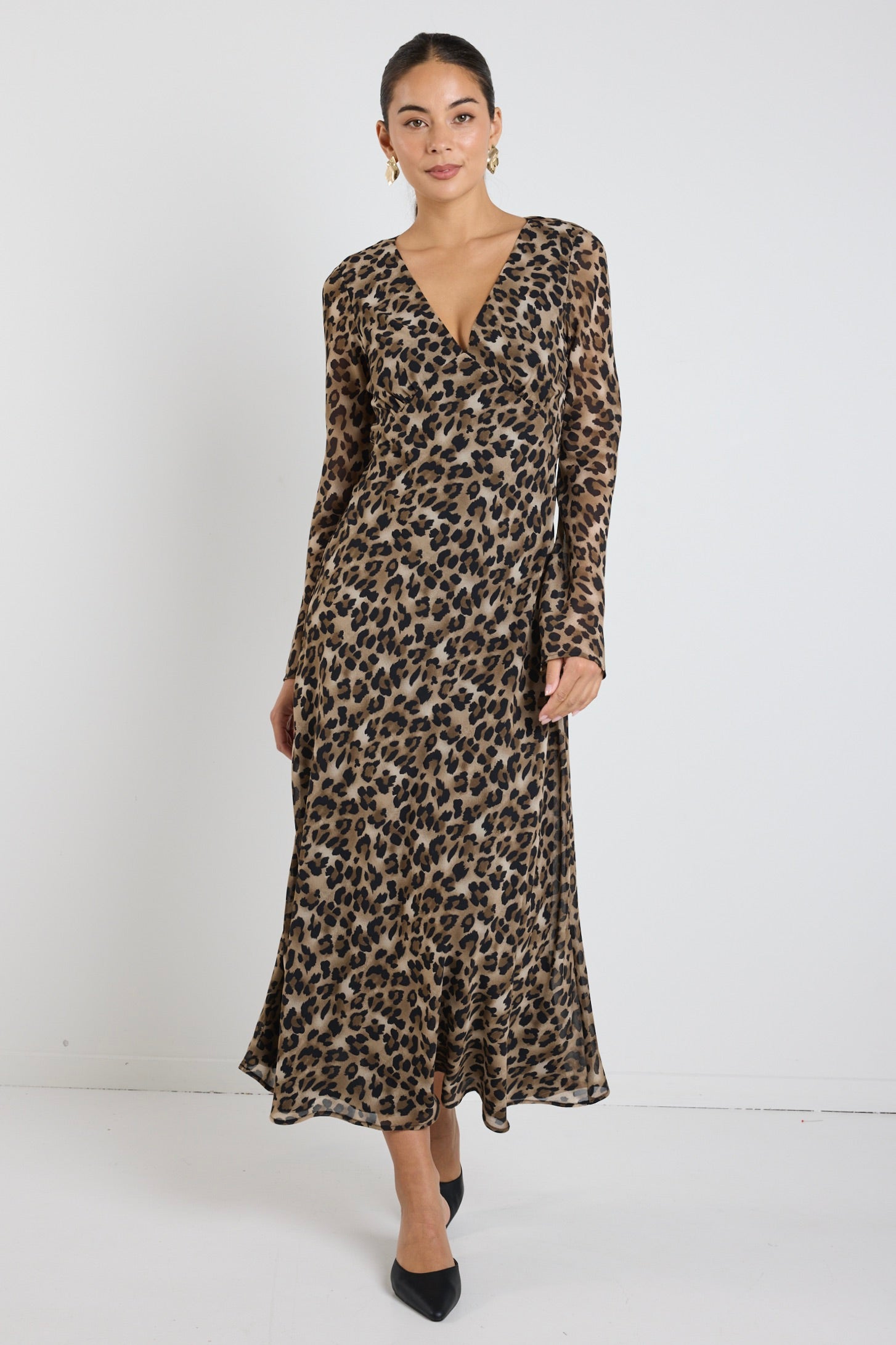 Bring the drama in the most wearable way with the Chateau leopard dress. This flattering bias cut midi drapes effortlessly, combining a fun leopard print with an ultra-feminine silhouette. Long sleeves and a chic v-neckline make it a luxe go-to for transeasonal dressing.
