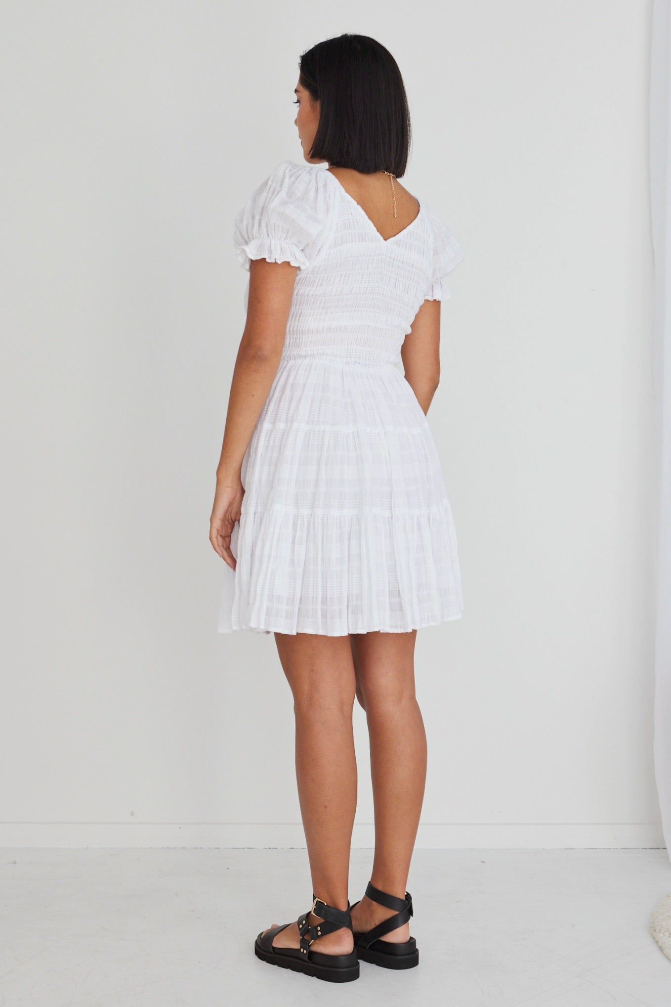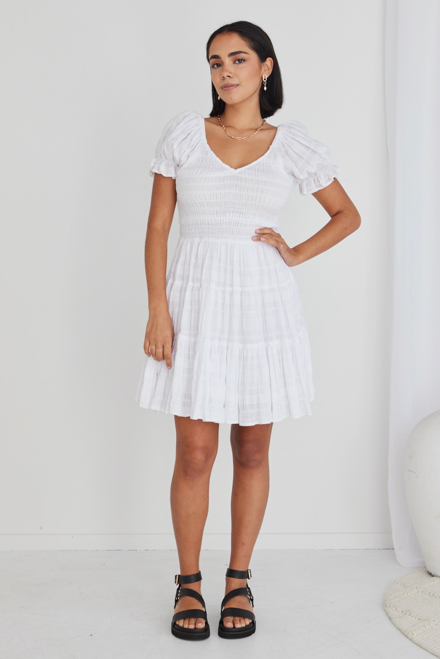 The Heidi mini dress is the ultimate summer fit! Featuring a shirred bodice and V neckline for a super flattering fit. - Shirred bodice - V neckline - Mini length - Main: 95% Cotton, 5% Elastane - Lining: 100% Cotton