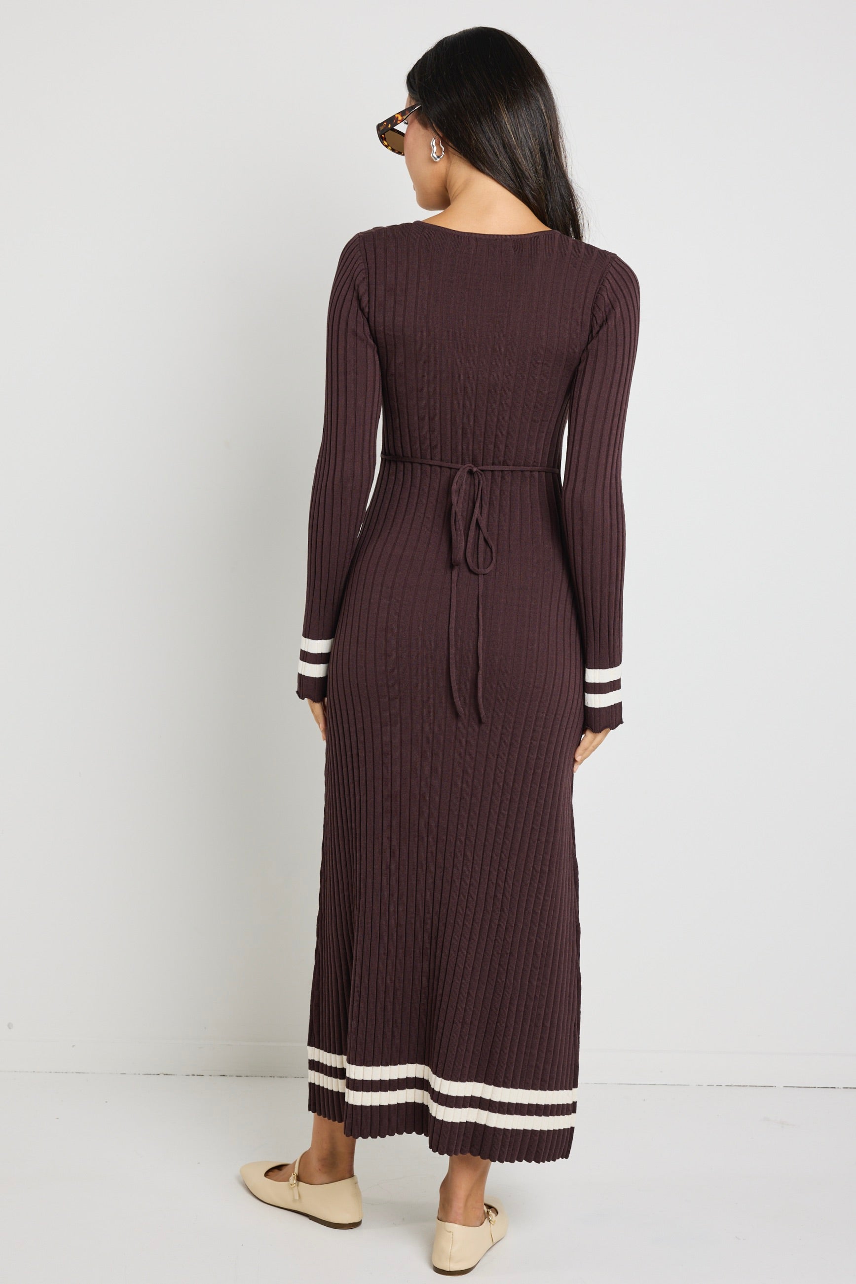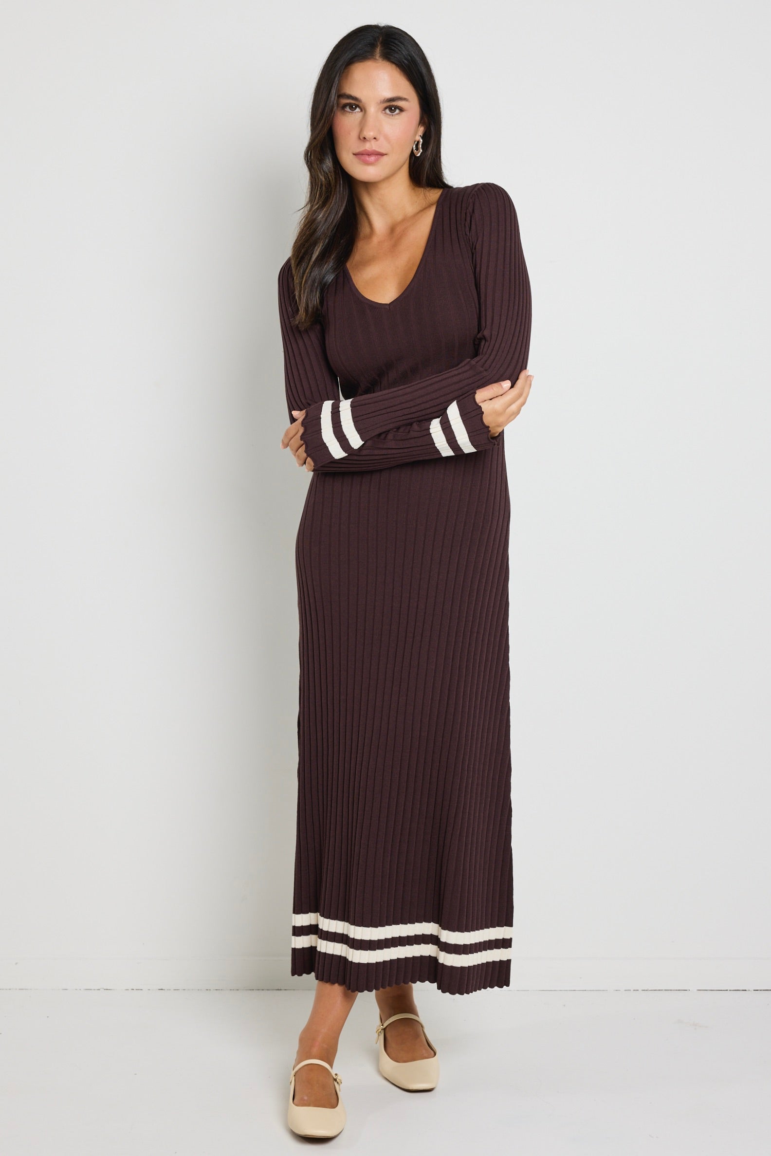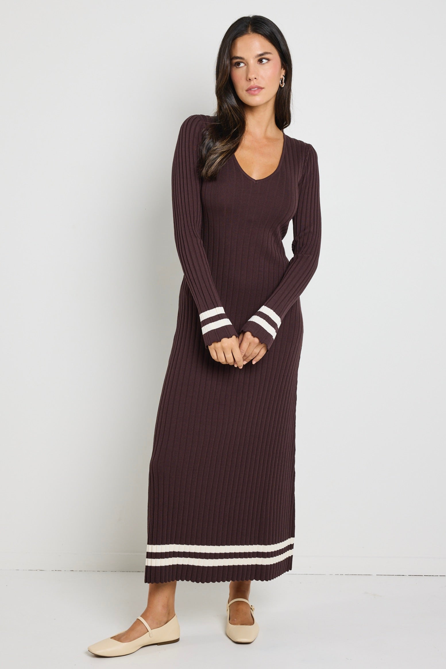 Timeless elegance with a sporty-chic twist, this chocolate ribbed maxi dress is a standout piece for effortless dressing. Made from a soft, stretchy knit, it hugs the body in all the right places while keeping you comfortable all day long. The deep V-neckline adds a flattering touch, while the contrast stripe detail at the cuffs and hem gives it a fresh, modern edge.