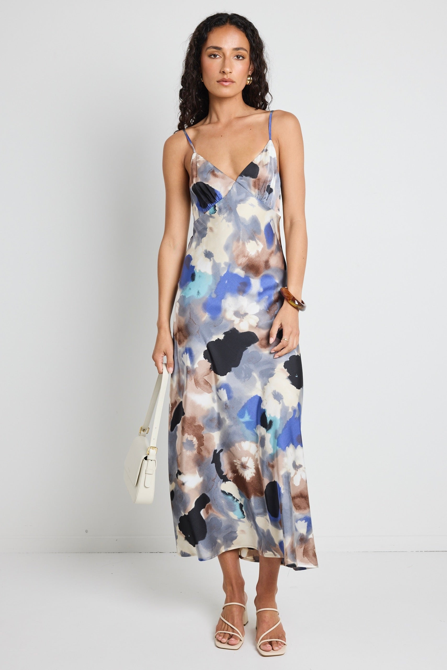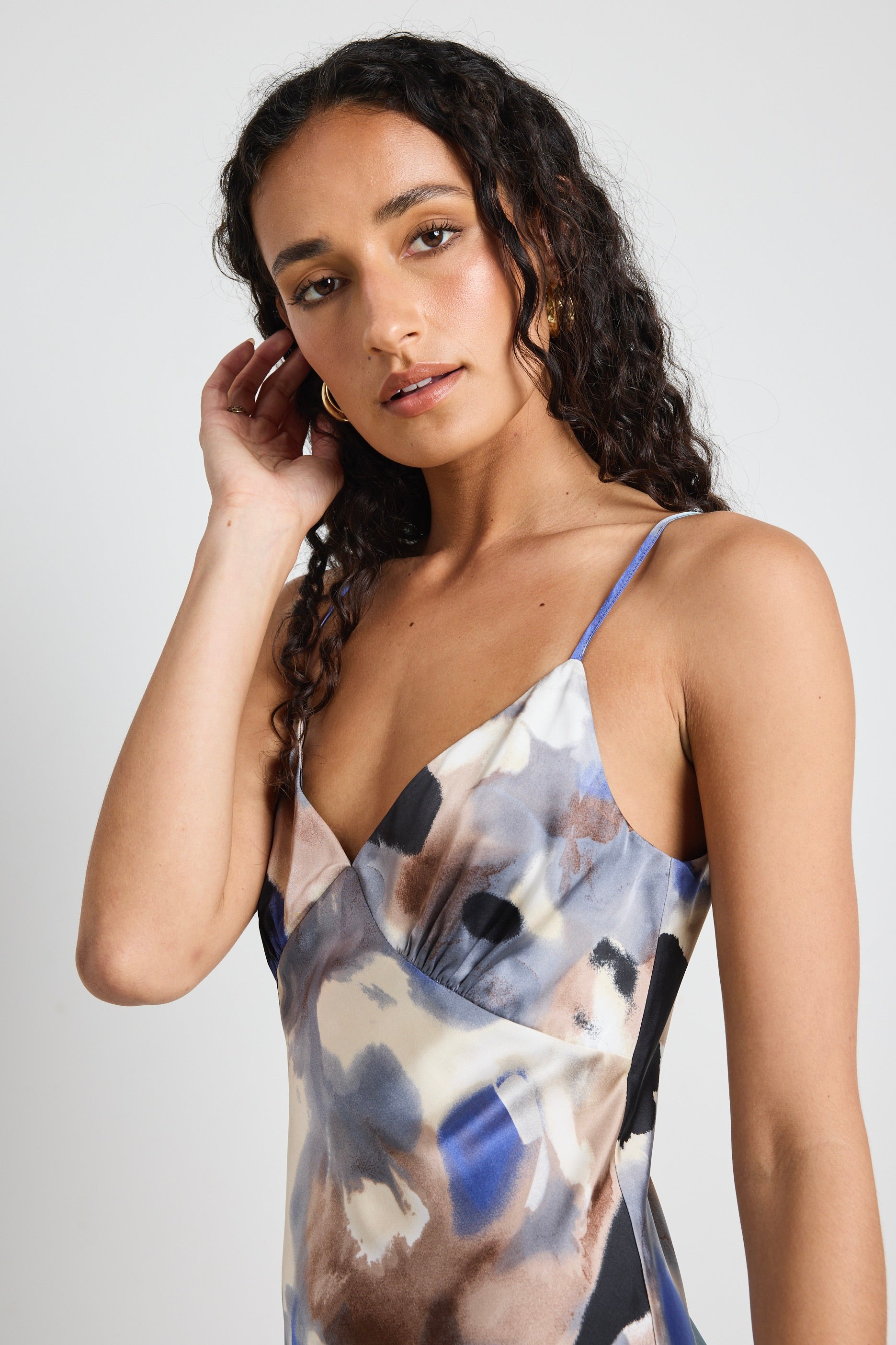Make a statement with the Otherworldly Champagne Navy Watercolour Dress. This dreamy slip dress features an abstract watercolour print in soothing shades of blue, brown, and cream, giving it an ethereal feel. The bias-cut silhouette softly skims the body, while the delicate strappy sleeves add a touch of elegance. Perfect for day-to-night transitions, this dress can be styled with heels or edgy boots for a bold contrast.
