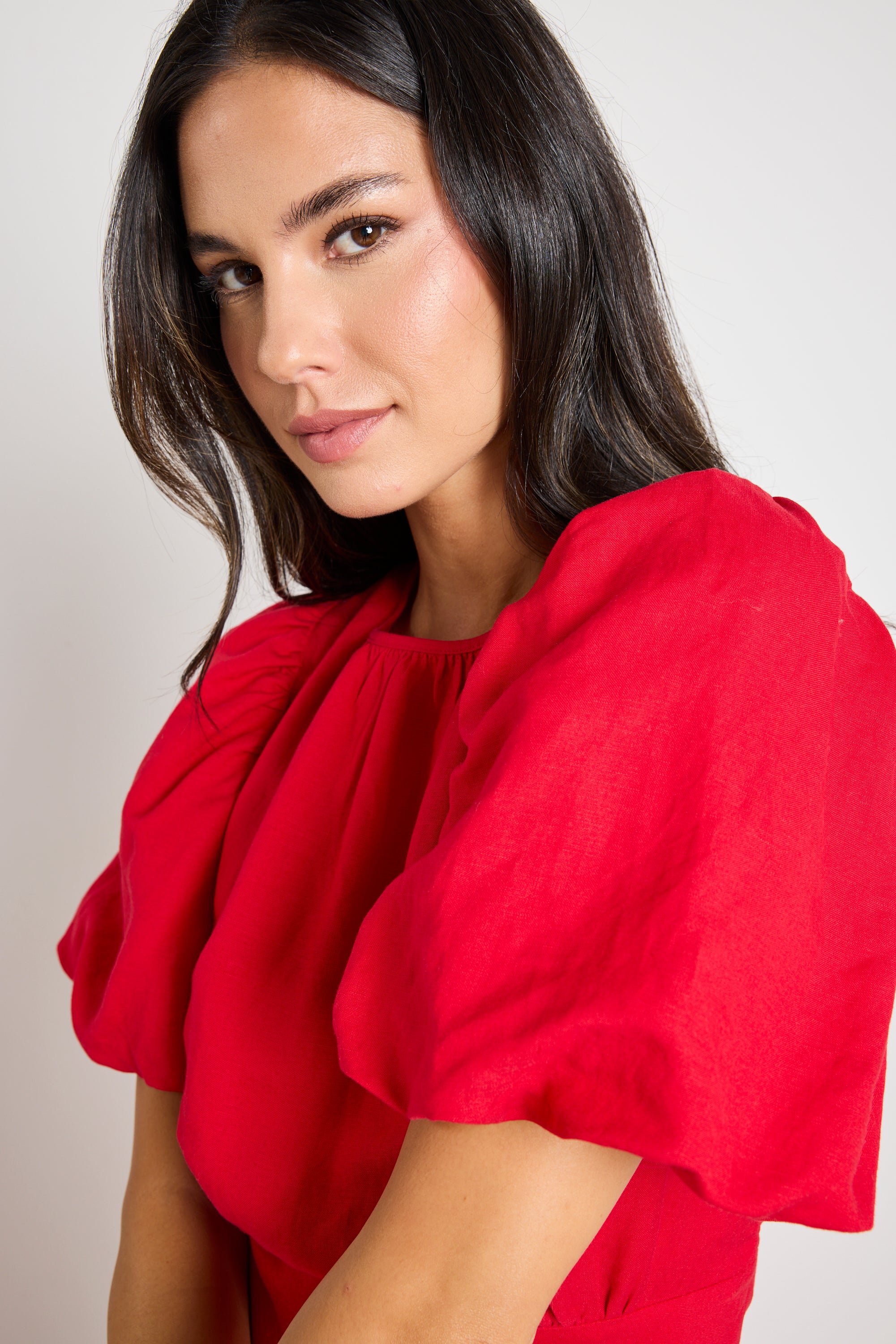 Make a bold statement in the Stage Cherry Dress, a stunning piece that blends timeless elegance with a modern silhouette. Designed in a rich cherry red, this dress features dramatic puff sleeves and a flattering fitted waist that flows into a graceful maxi-length skirt. The breathable linen-viscose blend ensures comfort while maintaining a structured yet effortless look.
