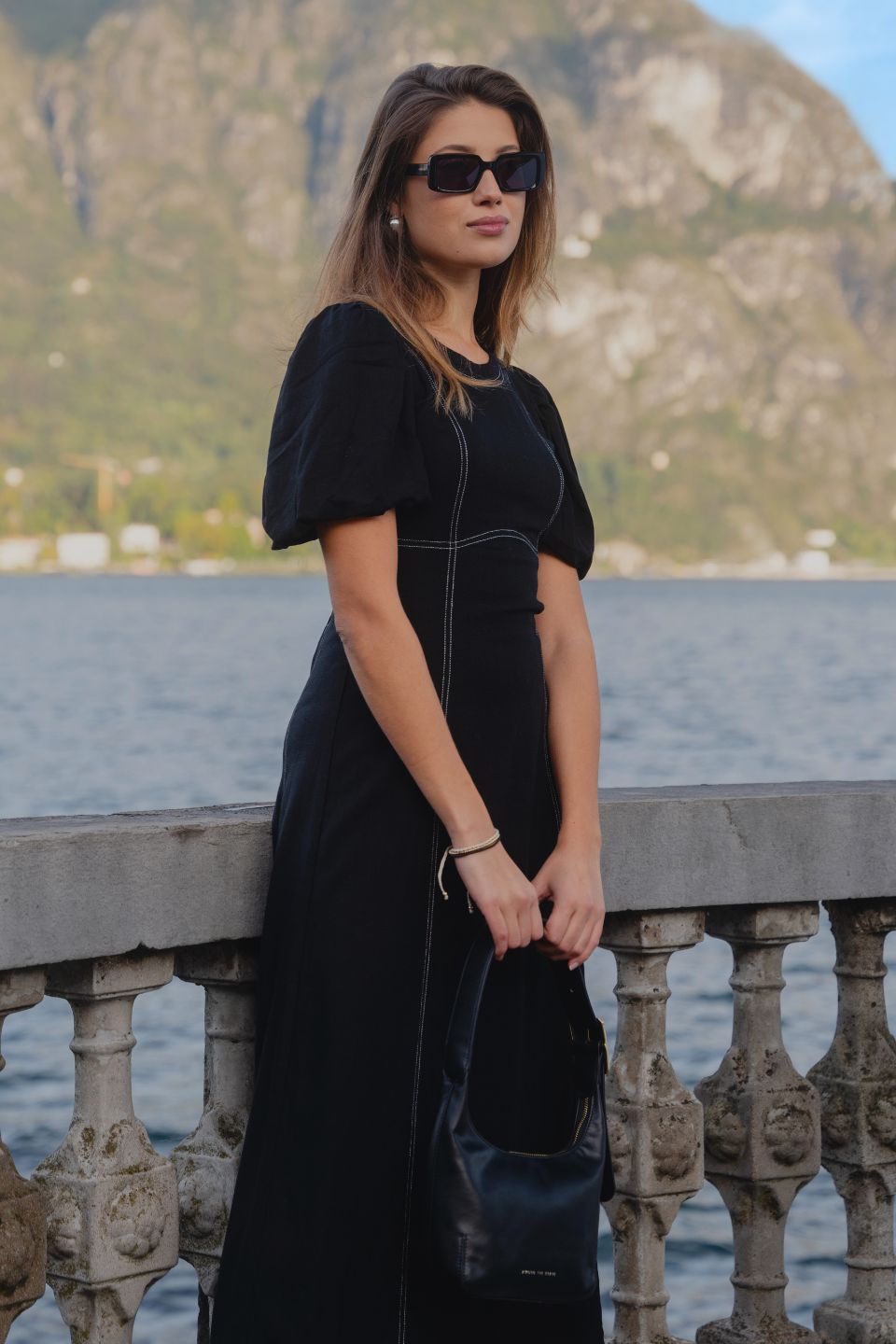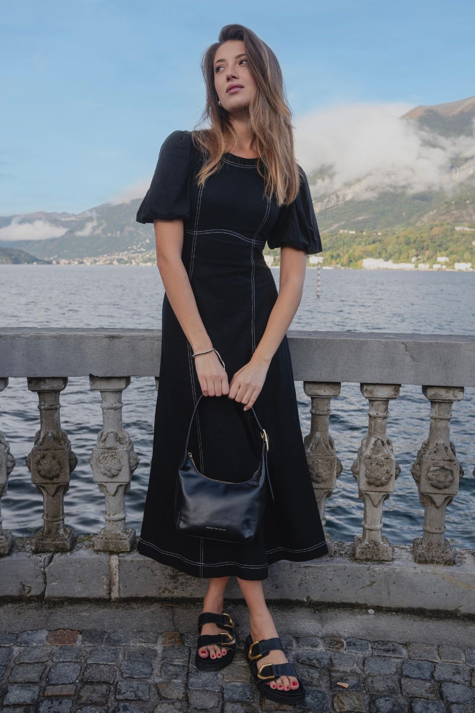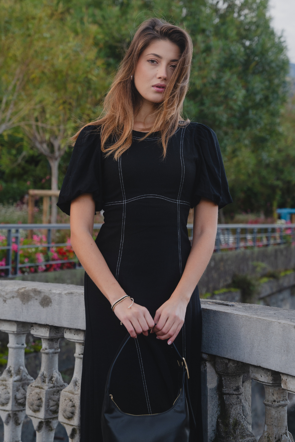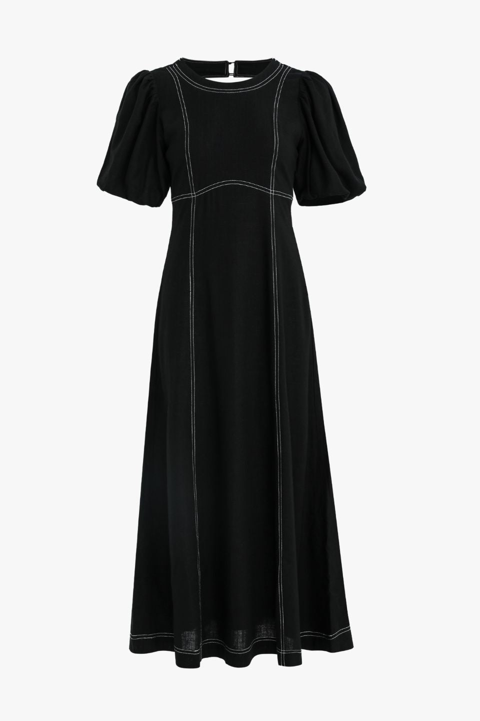 Expertly crafted with a blend of linen, this midi dress features puff sleeves for a modern touch. Lightweight and versatile, it's the perfect addition to your summer wardrobe. With a shirred back for a flexiable and comfortable fit, this dress also features a gorgeous back cut out. Feel confident and comfortable in this stylish black dress, perfect for any occasion.