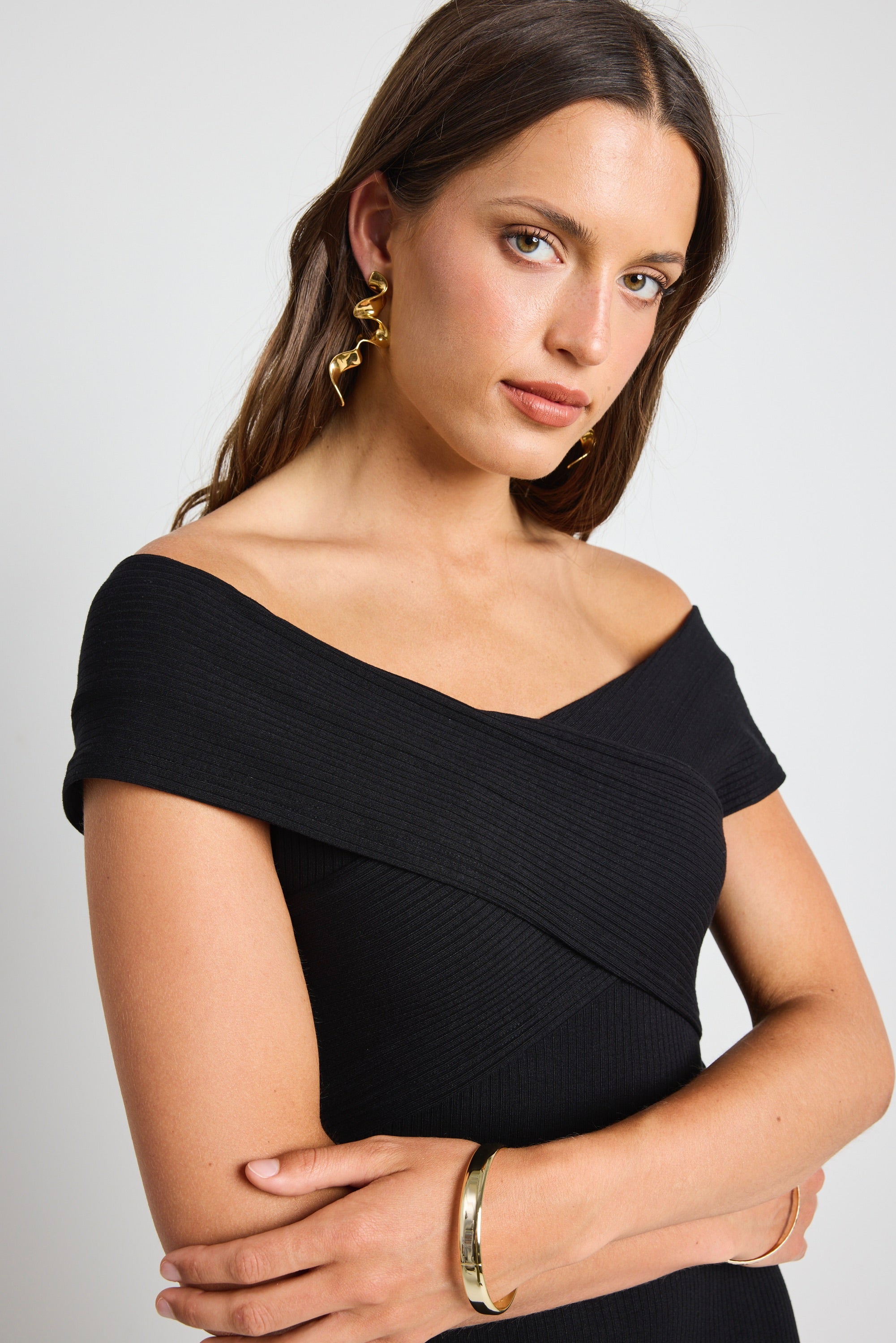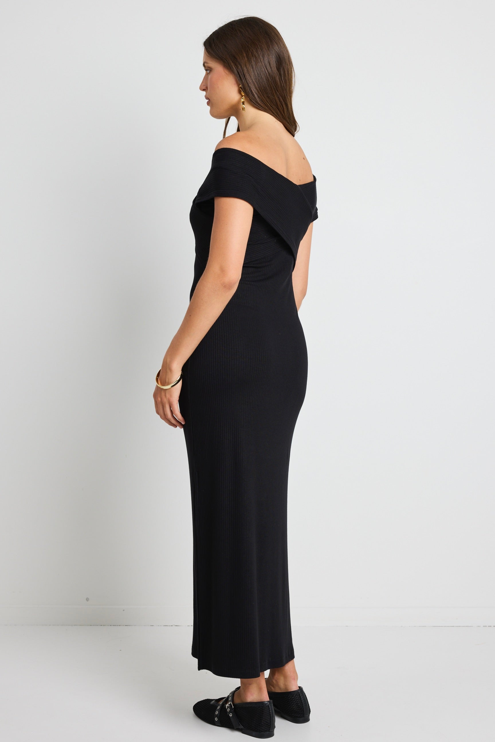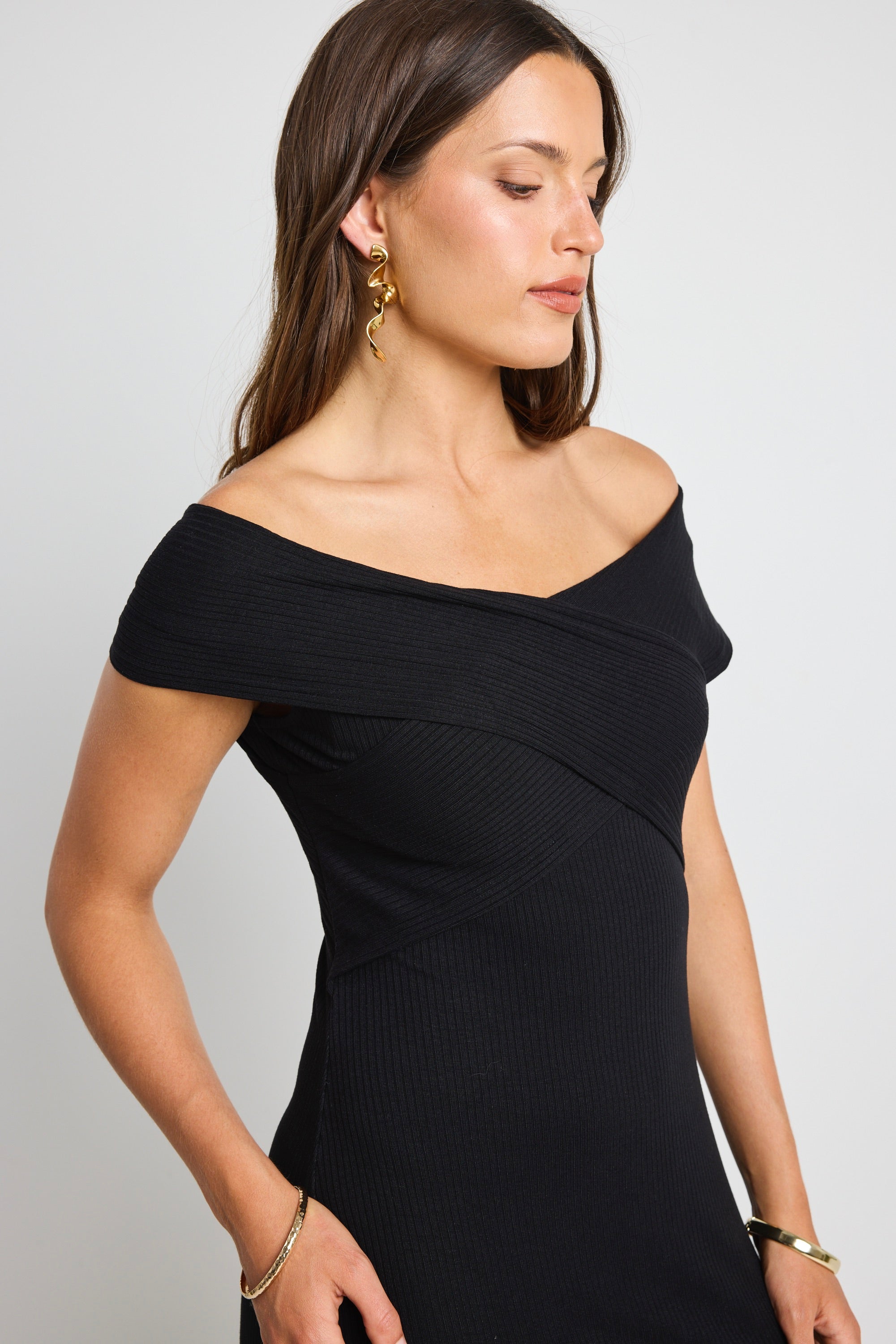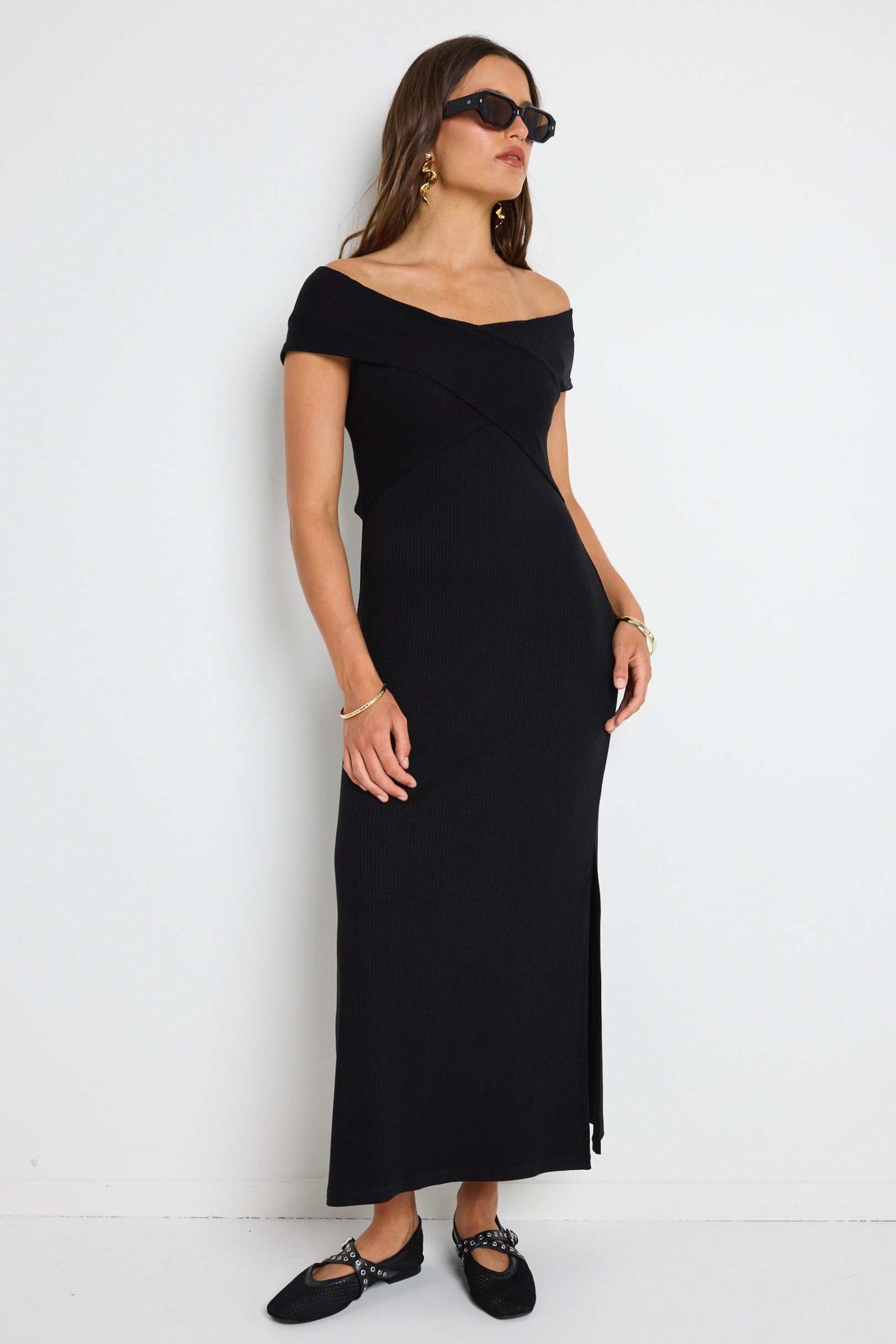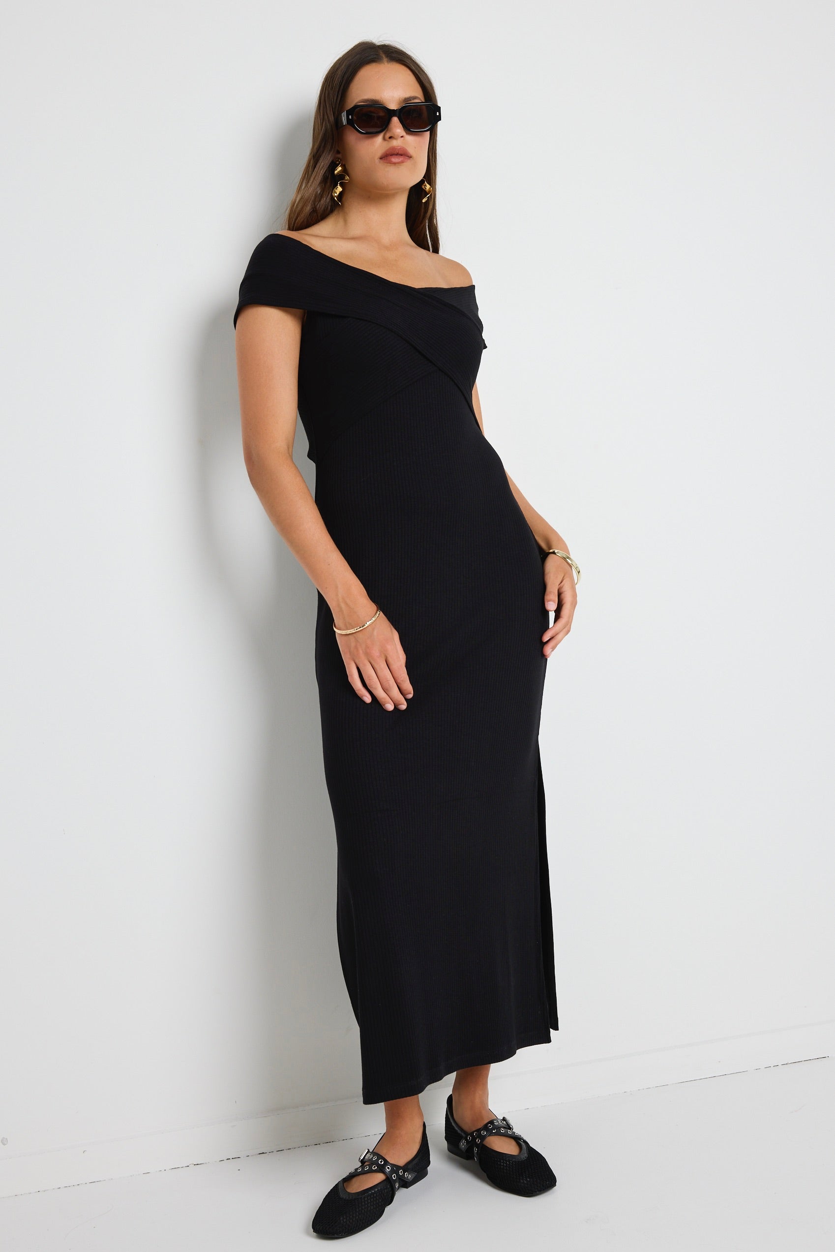 Effortlessly elegant and timelessly chic, the Alfa Black Rib Off Shoulder SS Midi Dress is your go-to. Featuring a beautifully structured off-shoulder neckline and figure-hugging ribbed fabric, this dress flatters your silhouette with effortless ease. The subtle side slit adds a touch of allure, perfect for high-low dressing. Style it casually with flats or elevate it with heels and statement jewellery for an evening out.