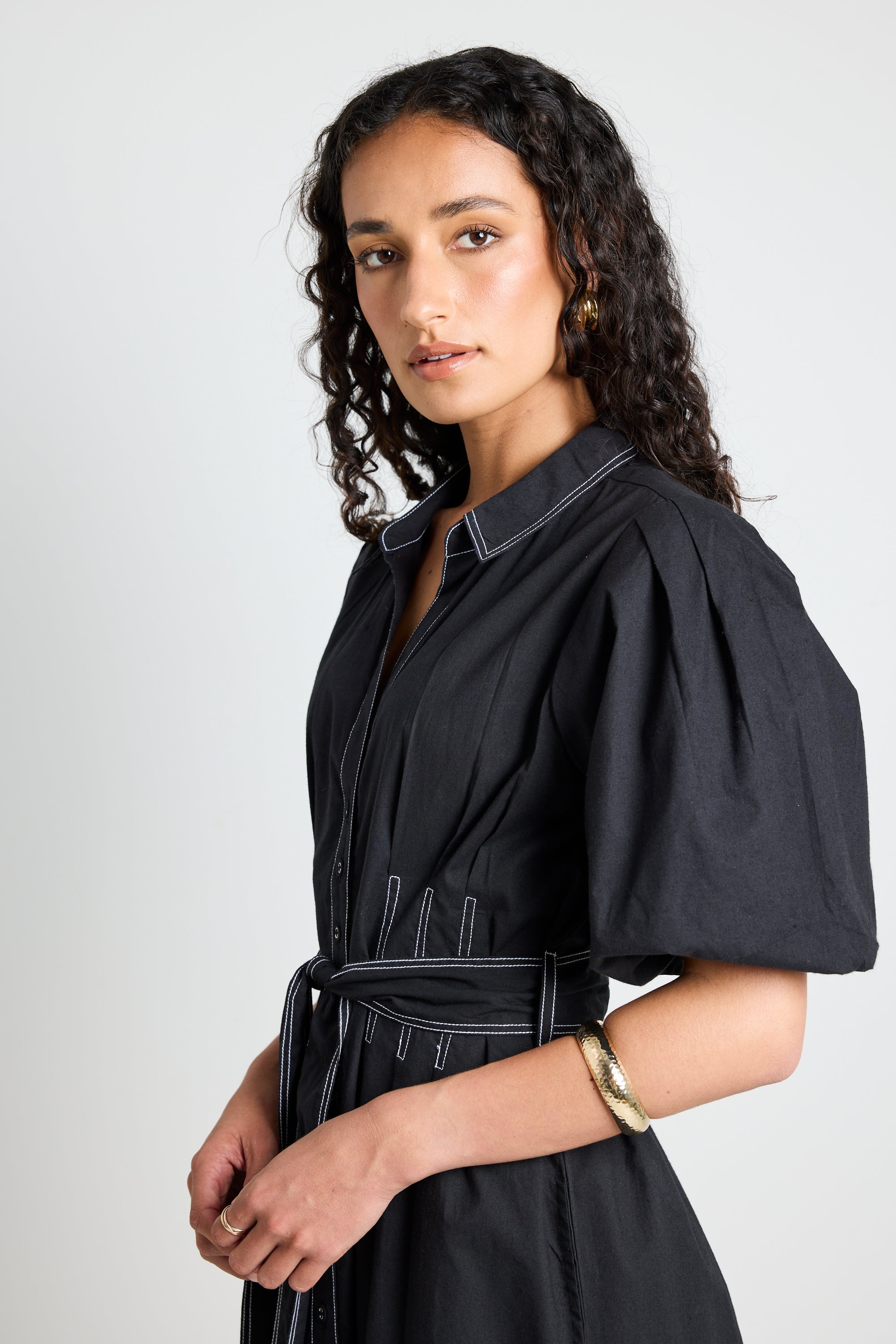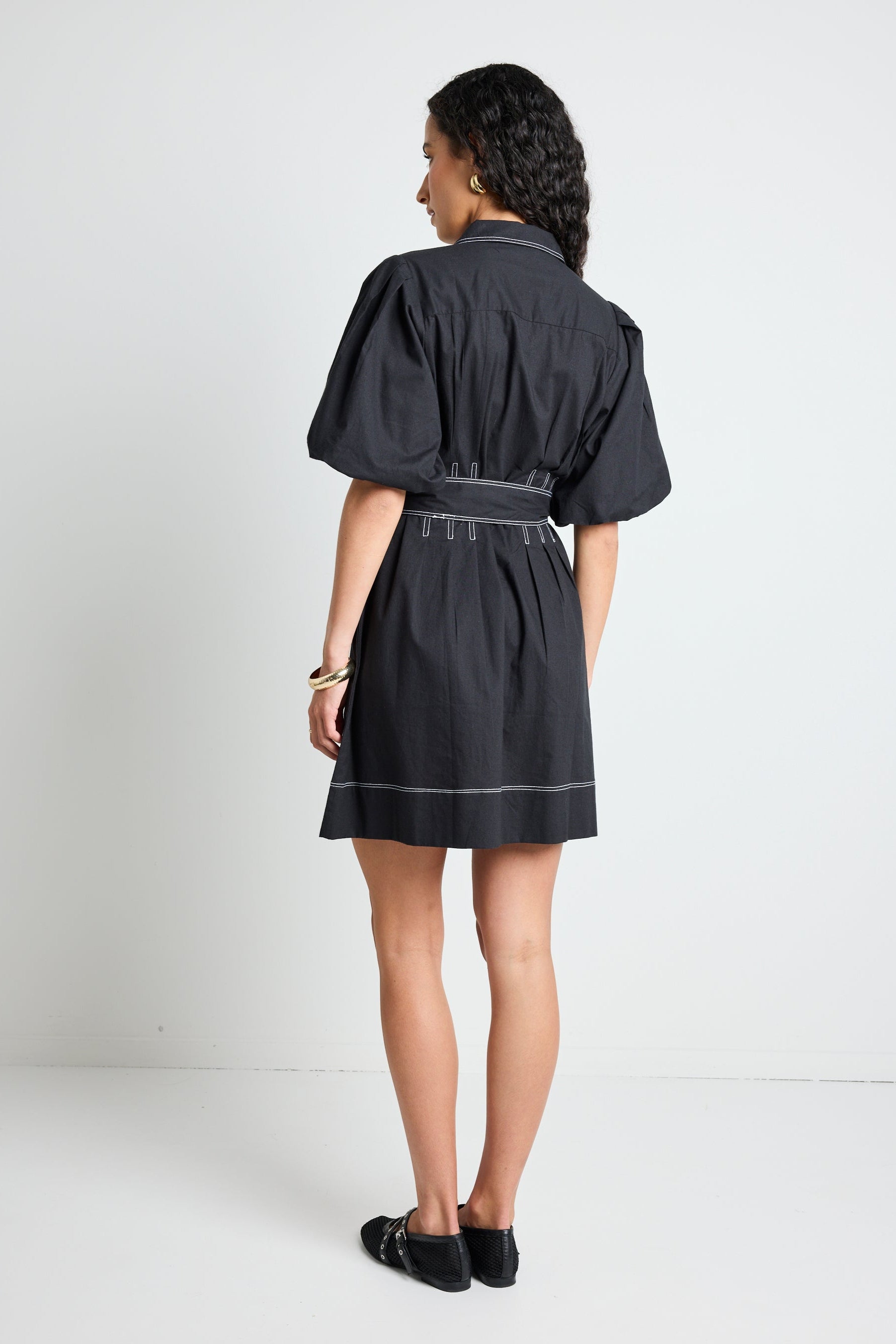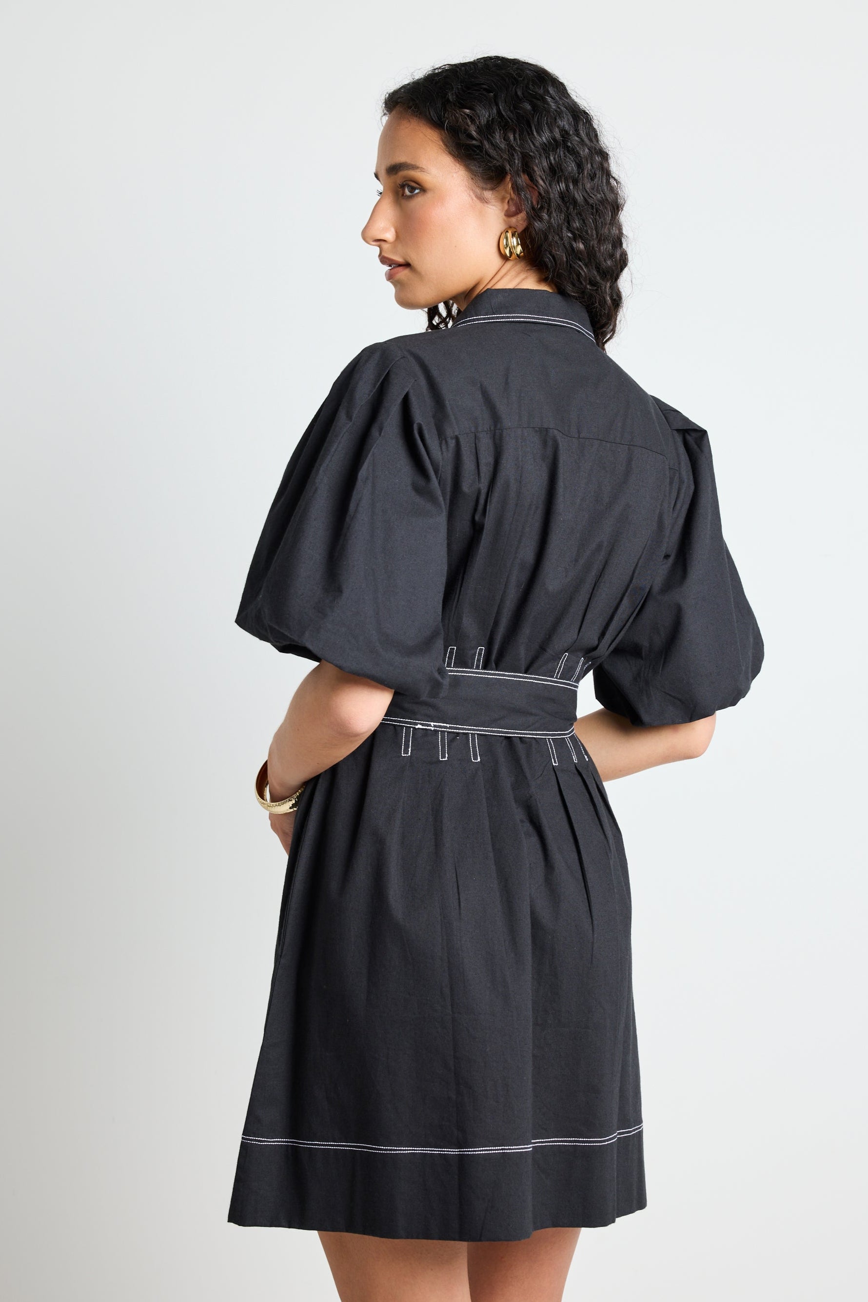 Timeless elegance meets effortless style with the Sundown Black Dress. Designed with a modern silhouette, this versatile mini dress features bold puff sleeves, contrast stitching, and a waist-cinching tie for a flattering fit. The structured yet lightweight fabric makes it perfect for any occasion, whether you're dressing up for a night out or keeping it casual with sneakers.